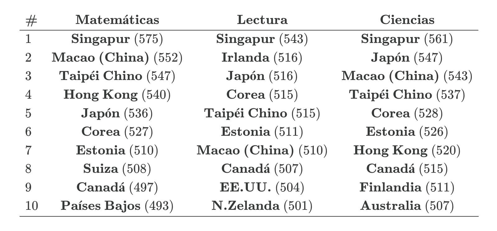 Singapur (Matemáticas, 575), Macao (China) (Matemáticas, 552), Taipéi Chino (Matemáticas, 547), Japón (Ciencias, 547), Hong Kong (China) (Matemáticas, 540), Corea (Ciencias, 528), Estonia (Ciencias, 526), Suiza (Matemáticas, 508), Canadá (Ciencias, 515), Irlanda (Lectura, 516), Finlandia (Ciencias, 511), Australia (Ciencias, 507), Estados Unidos (Lectura, 504), Nueva Zelanda (Lectura, 501) y Países Bajos (Matemáticas, 493).
